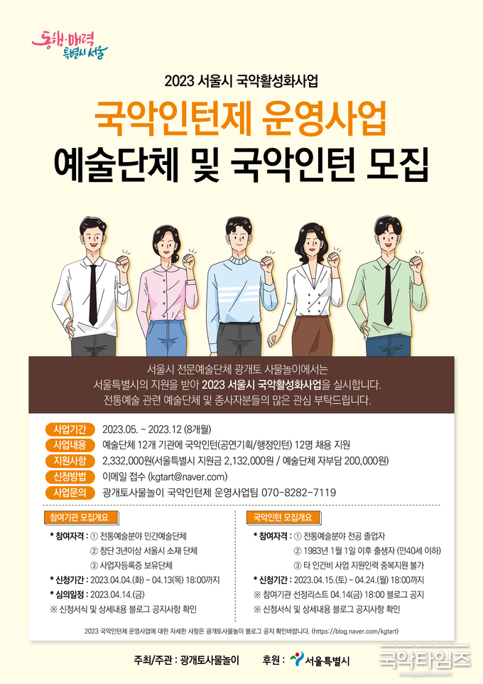 서울시 지정 전문예술단 광개토 사물놀이 예술단(대표 권준혁)과 서울특별시(시장 오세훈)는 오는 4월 4일부터 14일까지 서울시 국악활성화 사업 <국악인턴제> 에 참여할 기관 및 단체들을 공개 모집한다.