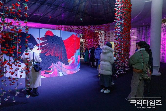 황란의 설치작품과 ‘라잇톨로지’의 라이팅 아티스트 크리스공과의 협업으로 빛과 어둠의 대비 그리고 오방컬러를 기반으로 한 스토리 연출을 통해 고요한 풍경에서 빛을 매개로 어둠을 뚫고 빛을 쏟아내는 과정을 희망적이고 미래적인 또다른 세상의 새로운 모습으로 승화시킨다.