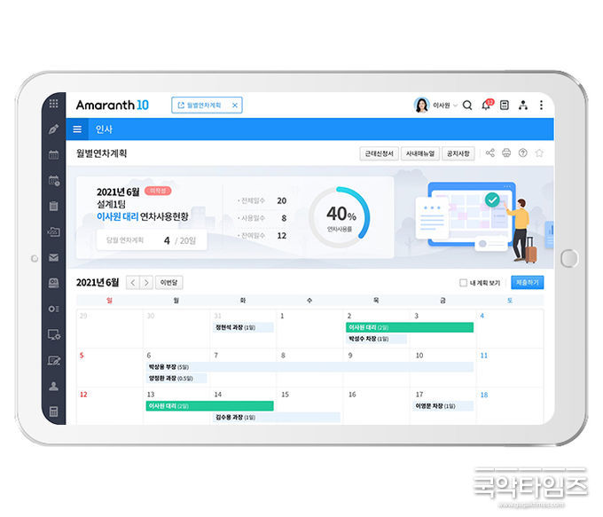 아마란스 10(Amaranth10)은 강화된 근로기준법에 맞춰 근태 관리 프로세스를 자동화했다. 인사 담당자가 수시로 바뀌는 근로기준법을 하나하나 찾아서 대조하지 않아도 시스템에 자동 반영된다.