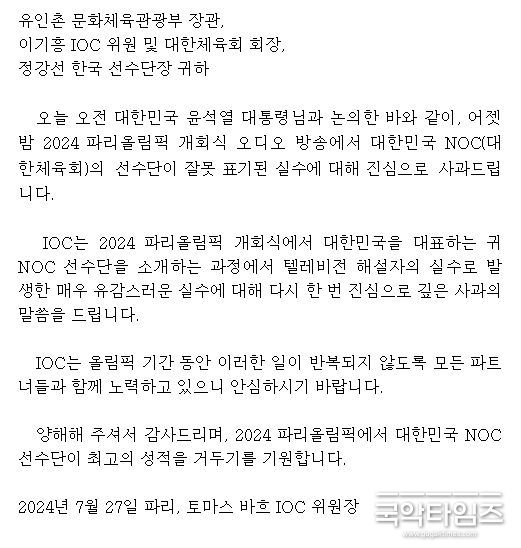 국악타임즈 황원일 기자 | 문화체육관광부 유인촌 장관은 국제올림픽위원회(IOC) 토마스 바흐 위원장으로부터 공식 사과서한을 전달받았다. 이는 ‘2024 파리하계올림픽’ 개회식 중 우리 선수단 입장 순서에서 국가명을 ‘북한’이라고 잘못 표시한데 대한 국제올림픽위원회(IOC)의 사과 조치이다.