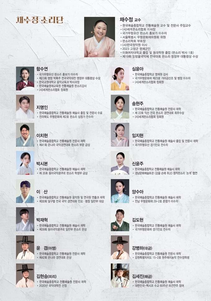 김경임은 故 김명신 명창의 여동생이고, 제주에서 무속인으로 활발한 활동을 하고 있다. 채수정 소리단 대표 채수정 교수는 현재 한국예술종합학교 교수 및 전문사 주임교수로 재직 중이며 (사)세계판소리협회 이사장, 판소리학회 부회장을 맡고 있다.