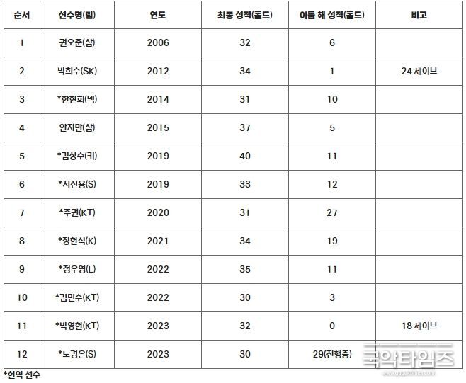 역대 시즌 30홀드 이상을 기록한 11명의 선수 중에 다음 시즌에도 30홀드를 달성한 선수는 단 한 명도 없었다.