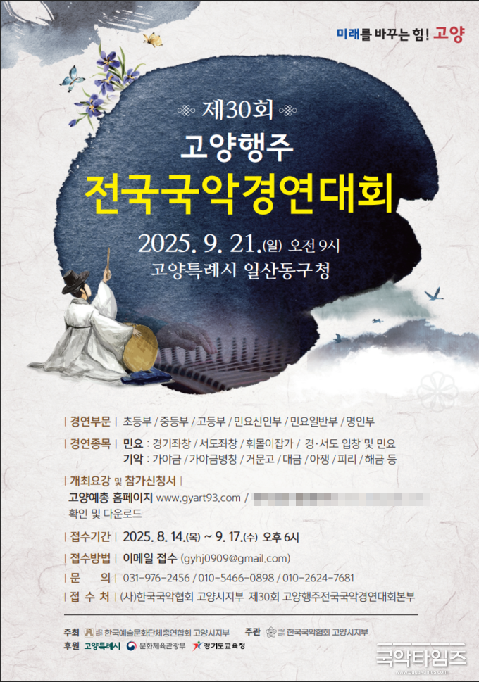 제28회 창원(경남)전국국악경연대회 요강 기 간 : 2025. 11. 15.(토-예·본선) 장 소 : 창원시늘푸른전당(경남 창원시 의창구 두대로 97/☎055-712-0372) 주 최 : 창원전국국악경연대회 조직위원회 주 관 : 전문예술단체 ‘손양희국악예술단’, 경남무형유산연합회, 경상남도 판소리‘수궁가’보존회 후 원 : 문화체육관광부, 교육부, 경상남도, 경상남도교육청, 경상남도창원교육지원청, 창원KBS, MBC경남, 경남신문, 경남도민일보, (주)부경 특별후원 : (주) 삼양마린 ■ 경연부문 ▷성악부문(판소리, 민요, 가야금병창) : 초등부, 중·고등부, 신인부, 일반부 ▷기악부문(관악, 현악) : 초등부, 중·고등부, 신인부, 일반부 ▷연희부문(무용, 풍물) : 초등부, 중고등부, 신인부, 일반부 ■ 참가자격 ▷일반부 – 대학생(전공자)을 포함한 만 18세 이상의 모든 남, 여 ▷신인부 – 만 18세 이상의 모든 남, 여 ▷초·중·고등부 – 초중고등학교에 재학 중인 학생 또는 이에 준하는 자 ■ 경연시간 참가비 및 고수비 : 전체 없음. 접수확인 및 순번표 배정 시간 – 중·고등부, 일반부 : 09:00~09:20 (시간엄수) - 초등부, 신인부