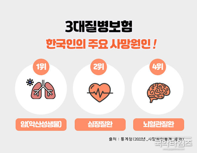 국악타임즈 편집부 | 3대질병으로 일컬어지는 암, 뇌혈관질환, 심혈관질환은 한국인의 주요 사망원인에서 상위를 차지하고 있으며, 이에 대한 진단비를 집중적으로 보장해 주는 보험상품을 3대질병진단비 보험이라 할 수 있다.