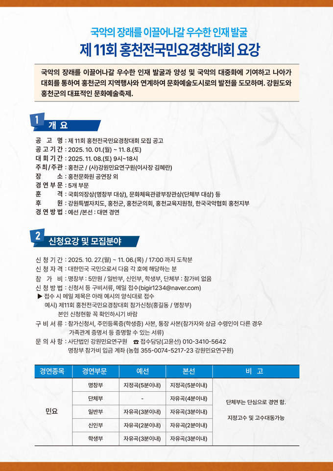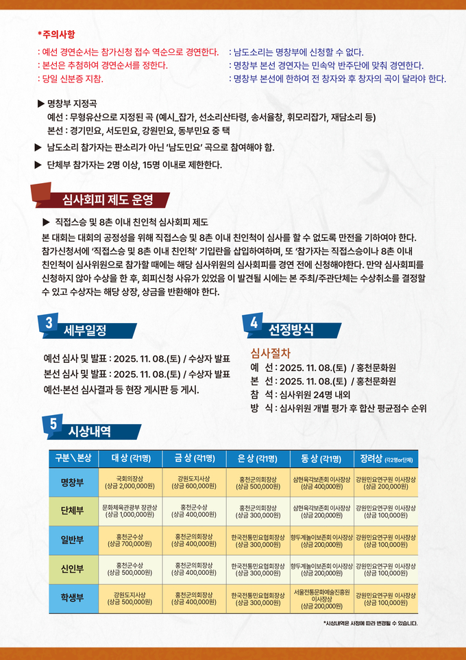 제28회 창원(경남)전국국악경연대회 요강 기 간 : 2025. 11. 15.(토-예·본선) 장 소 : 창원시늘푸른전당(경남 창원시 의창구 두대로 97/☎055-712-0372) 주 최 : 창원전국국악경연대회 조직위원회 주 관 : 전문예술단체 ‘손양희국악예술단’, 경남무형유산연합회, 경상남도 판소리‘수궁가’보존회 후 원 : 문화체육관광부, 교육부, 경상남도, 경상남도교육청, 경상남도창원교육지원청, 창원KBS, MBC경남, 경남신문, 경남도민일보, (주)부경 특별후원 : (주) 삼양마린 ■ 경연부문 ▷성악부문(판소리, 민요, 가야금병창) : 초등부, 중·고등부, 신인부, 일반부 ▷기악부문(관악, 현악) : 초등부, 중·고등부, 신인부, 일반부 ▷연희부문(무용, 풍물) : 초등부, 중고등부, 신인부, 일반부 ■ 참가자격 ▷일반부 – 대학생(전공자)을 포함한 만 18세 이상의 모든 남, 여 ▷신인부 – 만 18세 이상의 모든 남, 여 ▷초·중·고등부 – 초중고등학교에 재학 중인 학생 또는 이에 준하는 자 ■ 경연시간 참가비 및 고수비 : 전체 없음. 접수확인 및 순번표 배정 시간 – 중·고등부, 일반부 : 09:00~09:20 (시간엄수) - 초등부, 신인부