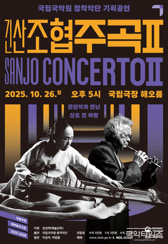 국립국악원 창작악단 기획공연 《긴산조 협주곡Ⅱ》는 오는 10월 26일(일) 오후 5시 국립극장 해오름극장에서 열린다. 예매는 국립극장 누리집(www.ntok.go.kr) 또는 NOL 티켓(tickets.interpark.com)에서 가능하며, R석 5만원, S석 3만원, A석 2만원이다. 문의 02-580-3300.