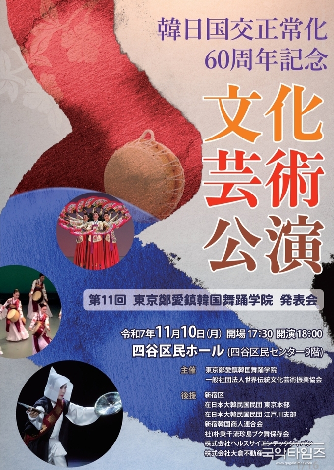 한국 전통춤이 한·일 문화교류의 무대에서 다시 주목받는다. 사단법인 세계전통문화예술진흥협회와 정애진한국무용학원이 주최하고 재일본대한민국민단 동경지부 등 여러 단체가 후원하는 ‘한‧일국교정상화 60주년 기념공연’이 오는 2025년 11월 10일 오후 5시 30분, 동경 신주쿠 요츠야구민회관에서 열린다. 이번 공연은 한·일 양국의 명인‧명무들이 한데 어우러져 예술적 교류와 소통을 도모하는 자리로 마련됐다.