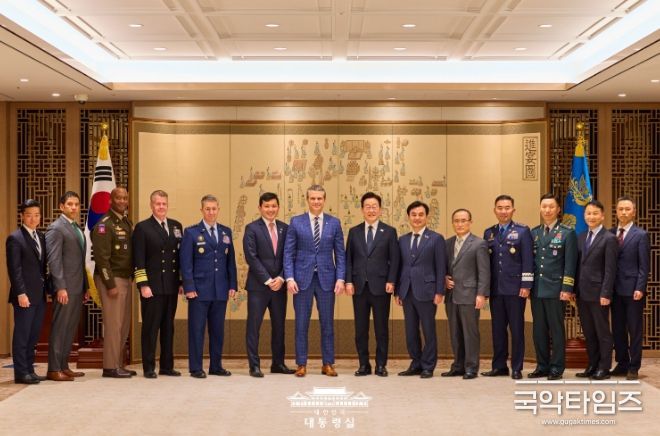 국악타임즈 편집부 | 이재명 대통령은 11월 4일 오후 대통령실에서 한미안보협의회의(SCM : Security Consultative Meeting) 참석을 위해 한국을 방문한 피트 헤그세스 미국 전쟁부장관의 예방을 받고 한미동맹이 미래형 포괄적 전략동맹으로 심화 발전해 나가는 데 있어 헤그세스 장관의 중요한 역할을 당부했다.