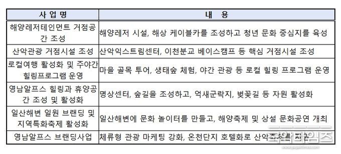 울산은 ‘일산해수욕장’ 등 해양자원과 ‘영남알프스’ 산악자원을 연계하여 ‘하루 더 머무는 체류형 복합레저도시’ 조성을 목표로 한다. 이를 통해, 제조업 중심의 산업구조를 고용친화적 관광산업으로 다변화하여 지역경제 활성화를 도모한다.
