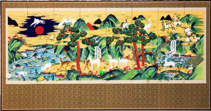 <신십장생도> 180x336(cm), 병풍에 아크릴릭·바다쓰레기, 2022