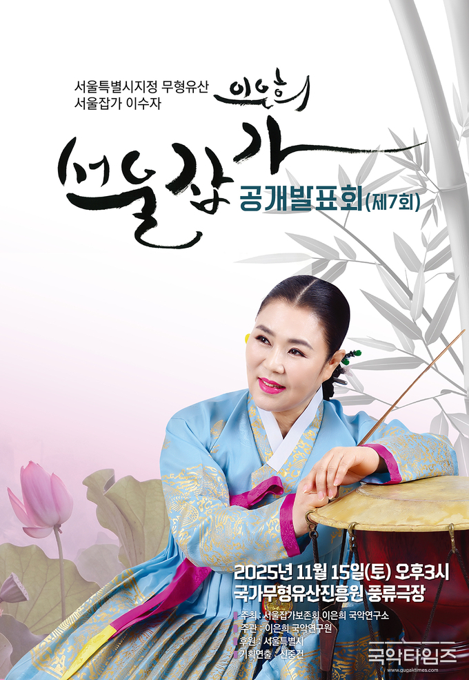 서울시 지정 무형유산 서울잡가 이수자 이은희가 오는 11월 15일 토요일 오후 3시 국가무형유산진흥원 풍류극장에서 제7회 공개 발표회를 개최한다. 이번 무대는 오랜 전통과 예인의 혼을 담은 ‘서울잡가’의 진수를 선보이며, 동시대 대중과 소통하는 의미 깊은 시간으로 마련된다.