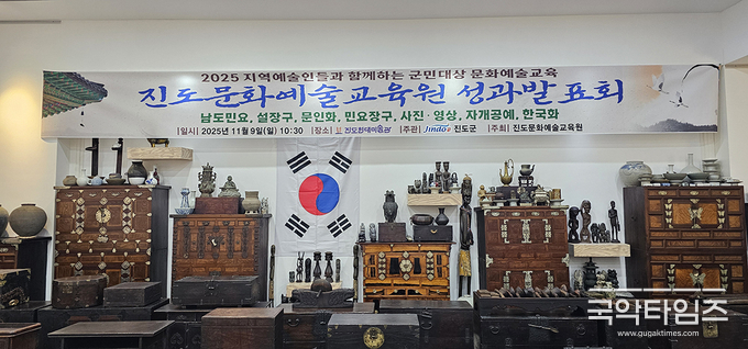 2025년 11월 9일(일) 오전 10시 진도현대미술관 1층 전시관 실내 계단을 통해 2층에 올라서니 100여 평 넓이의 공간 앞쪽과 중앙 로비에는 작은 무대가 마련되어 있었고, 정면 상단에 길게 늘어선 2025년 지역예술인들과 함께하는 군민대상 문화예술교육 <진도문화예술교육원 성과 발표회> 펼침막이 보였다. 2층 입구에서부터 중앙 로비로 향하는 좌우 벽면과 벽을 가르는 사이사이 돌출 벽에는 동양화∙인문화∙자개공예품이 전시되어 있었다.