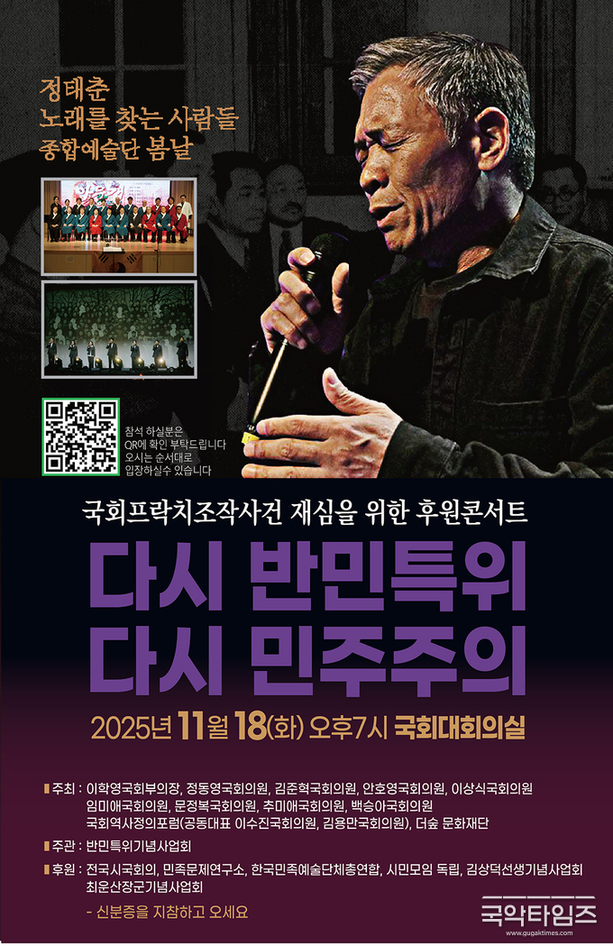 반민특위 강제해산 75년이 되는 올해 11월, 국회는 잊혀진 현대사의 진실을 다시 소환하는 두 개의 역사적 행사를 잇달아 맞는다. 먼저 11월 18일 오후 7시에는 ‘국회프락치조작사건 재심을 위한 후원콘서트’가 국회대회의실에서 열린다. 이어 11월 25일 오후7시에는 ‘반민특위와 12.3 내란’을 주제로 하는 대규모 국민토론회가 의원회관에서 개최된다. 두 행사는 서로 다른 형식으로 진행되지만, 모두 한국 민주주의의 뿌리를 다시 확인하고자 하는 하나의 흐름 위에 놓여 있다.
