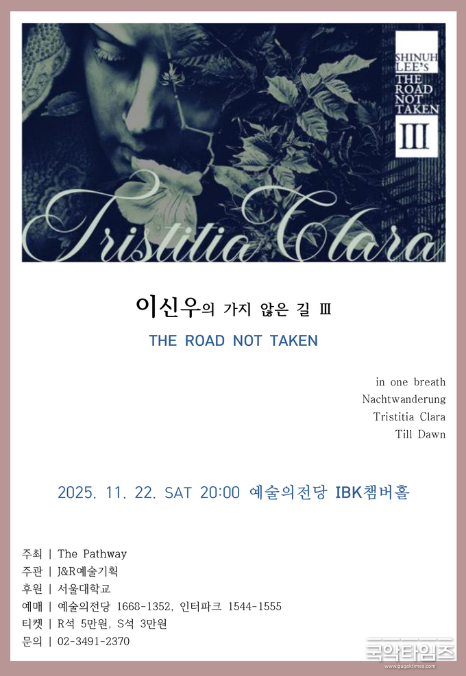 인간 존재의 근원과 본성을 음악으로 탐구해 온 작곡가 이신우의 연작 시리즈 ‘이신우의 가지 않은 길 Ⅲ(THE ROAD NOT TAKEN)’가 오는 11월 22일 토요일 오후 8시, 예술의전당 IBK챔버홀에서 관객을 만난다. The Pathway가 주최하고 J&R예술기획이 주관하며 서울대학교가 후원하는 이번 무대는 ‘밝은 슬픔’이라는 주제를 중심으로 밤과 새벽, 빛과 그림자를 사유하는 세 번째 여정을 펼쳐낸다.