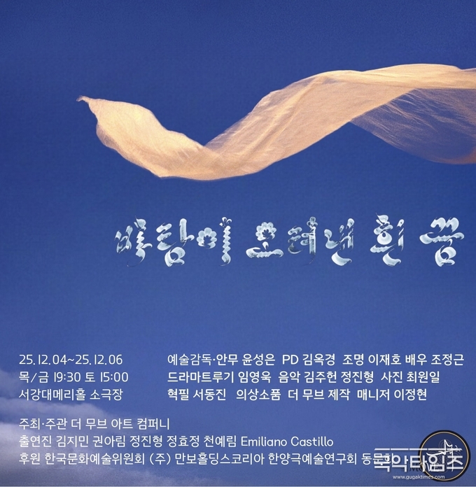 더 무브 아트 컴퍼니가 오는 12월 4일부터 6일까지 서강대 메리홀 소극장에서 현대무용 퍼포먼스 〈바람이 오려낸 흰 꿈〉을 선보인다. 예술감독 겸 안무가 윤성은을 중심으로 김주헌·정진형 작곡가, 드라마트루기 임영욱 등 창작진이 참여한 이번 작품은 민속학자 고(故) 심우성 선생의 넋전(魂祭)에서 영감을 받아, 죽은 이의 넋을 위로하고 남겨진 자의 감정을 움직임으로 치유하는 현대적 ‘넋의 춤’으로 확장했다. 한국 전통 의례가 지닌 정신성을 현대 무용극의 언어로 다시 열어 보이며, 삶과 죽음이 교차하는 경계의 자리를 깊이 있는 감성으로 탐구한다.