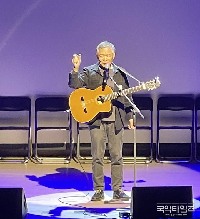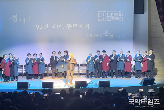 이어 무대에 선 정태춘은 특유의 국보급 저음과 깊은 울림이 하늘을 스치는 듯, 〈떠나가는 배〉를 불러 공연장의 감정을 다시 한 번 뒤흔들었다. 오랜 시간 사회적 약자와 역사의 그늘에 선 이들을 위해 노래해온 그는, 이번 공연 역시 출연료를 거절하고 참여했다. 마지막 앵콜곡 〈북한강에서〉는 조용한 서정과 잔잔한 희망을 동시에 남기며 공연 전체의 감정선을 완성했다.