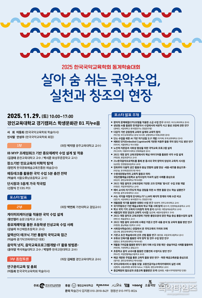 한국국악교육학회(회장 안성우)가 오는 11월 29일 토요일 오전 10시부터 오후 5시까지 경인교육대학교 경기캠퍼스 학생문화관 ‘지누e음’에서 ‘2025 한국국악교육학회 동계학술대회’를 연다. 올해 학술대회는 ‘살아 숨 쉬는 국악수업, 실천과 창조의 현장’을 주제로, 학교 현장에서 즉시 활용 가능한 실천 중심 수업 모델부터 미래형 국악 교육 패러다임까지 폭넓은 담론을 담아낼 예정이다.