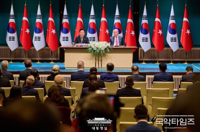 국악타임즈 편집부 | 튀르키예를 국빈 방문한 이재명 대통령은 24일(현지시간) 앙카라 대통령궁에서 레제프 타이이프 에르도안 대통령과 양자회담을 통해 방산, 원자력, 바이오, 인프라, 인적·문화 분야 등에서 협력을 강화해 나가자는 데 뜻을 모았다.