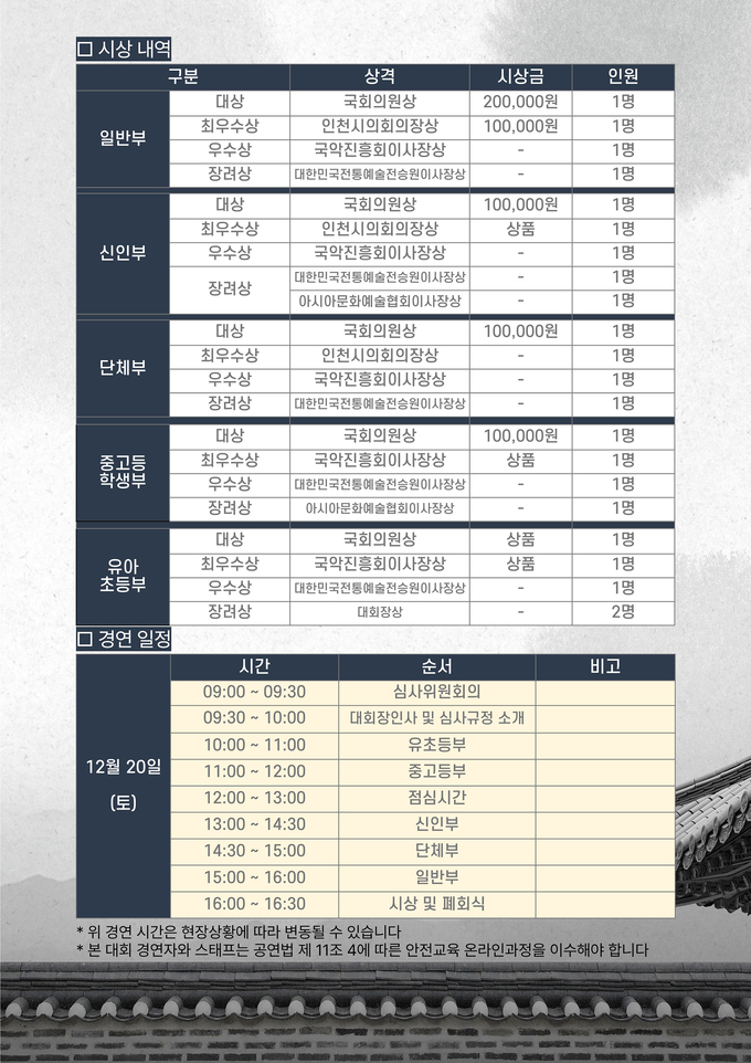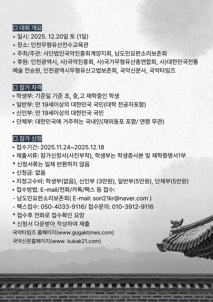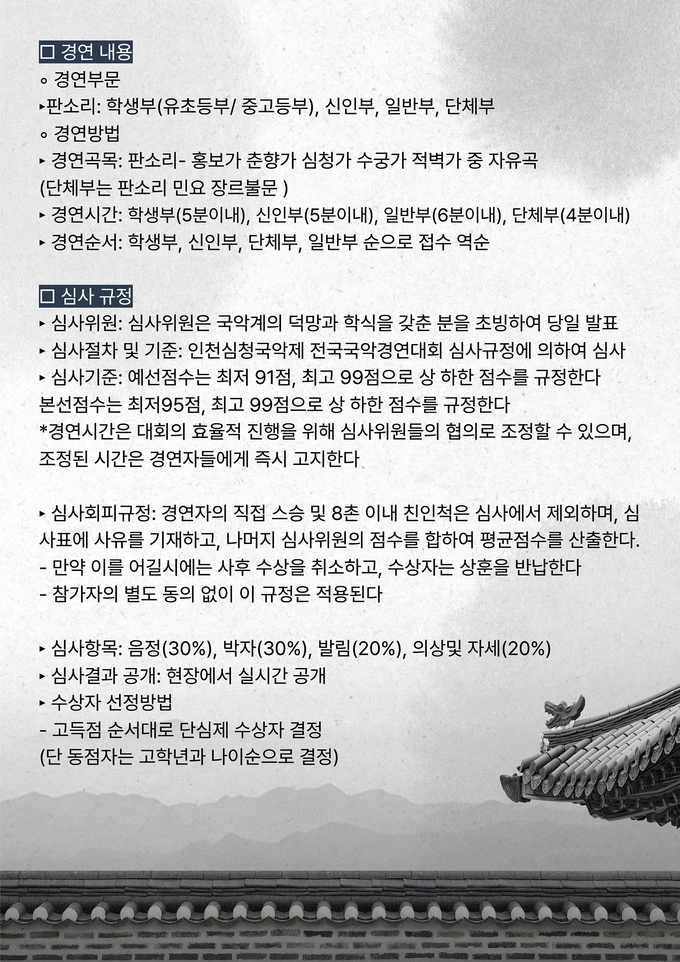 제4회 삼국유사 전통음악전국경연대회 요강 기 간 : 2025.10. 25.(토요일-예, 본선) 장 소 : 인각사 특설무대(대구광역시 군위군 삼국유사면 삼국유사로 250/☎054-383-1161) 주 최 : 대한불교조계종인각사 주 관 : 삼국유사전통음악경연대회 조직위원회, 도지정전문예술단체 손양희국악예술단 후 원 : 대한불교조계종 총무원, 대한불교조계종 제10교구 본사 은혜사, 문화재청, 대구광역시청, 군위군, 대구광역시교육청 특별후원 : 홈센타홀딩스, 보광산업 경연부문 ▷판소리 : 초등부, 중등부, 고등부, 신인부, 일반부 ▷민요 : 초등부, 중등부, 고등부, 신인부, 일반부 참가자격 ▷일반부 – 대학생(전공자)을 포함한 만 18세 이상의 모든 남, 여 ▷신인부 – 만18세(비전공자) 이상의 모든 남, 여 ▷초, 중, 고등부 – 초, 중, 고등학교에 재학 중인 학생 또는 이에 준하는 자 경연시간 참가비, 고수비 : 전체 없음. : 전체 없음. 경연시간 안내 ※ 접수확인 및 순번표 배정(시간엄수) : 접수처(안내처) ▷08:30~08:50 (고등부, 일반부), ▷10:00~10:20(신인부, 초등부, 중등부) ※ 예선 진행 (극락전-판소리) : (고등부)09: