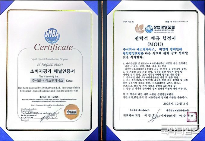 또한 12월3일 .(주)에스앤파낙스(서정호 대표)는 대한민국 소비자평가 단체 창업경영포럼과 전략적제휴 및 우수기업으로 인증 받으며 글로벌 시장으로 발돋움하는 계기를 마련했다.