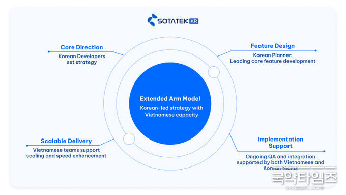 전통적으로 명확한 문서와 고정된 요구사항을 우선하는 방식과 달리, SotaTek Korea는 "Korean Hybrid Delivery" 모델을 구축했다. 이 모델에서 한국인 개발자·기획자·디자이너가 지속적으로 변경되는 요구사항과 고객과의 직접 커뮤니케이션이 필요한 핵심 업무를 담당한다. 반면, 베트남 개발자는 보다 안정적인 영역을 중심으로 ‘extended arm’ 역할을 수행하며 한국 팀의 역량을 확장하는 데 기여한다.