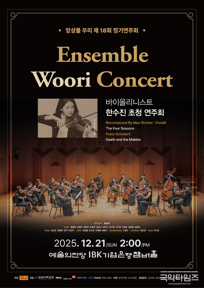한수진의 독주적 카리스마와 앙상블 우리 특유의 밀도 높은 현악 사운드가 만나는 이번 무대는, 연말을 맞아 깊이 있는 클래식 음악의 정수를 경험할 수 있는 의미 있는 시간이 될 것으로 보인다.