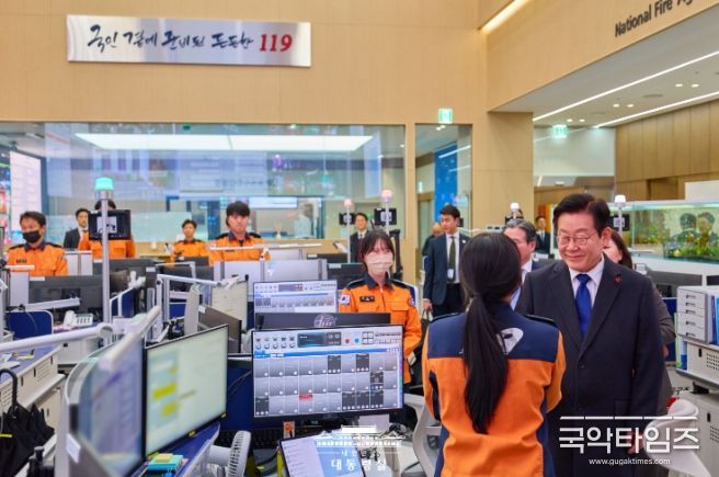 이 대통령은 먼저 소방청 119 종합상황실을 방문해 긴급 신고 접수와 출동 지휘 등 대응 현장을 직접 살폈다. 이어 중앙119 구급 상황 관리센터와 119 항공 운항 관제실에서 국민의 생명과 안전을 지키는 소방대원들의 노고를 치하했다.