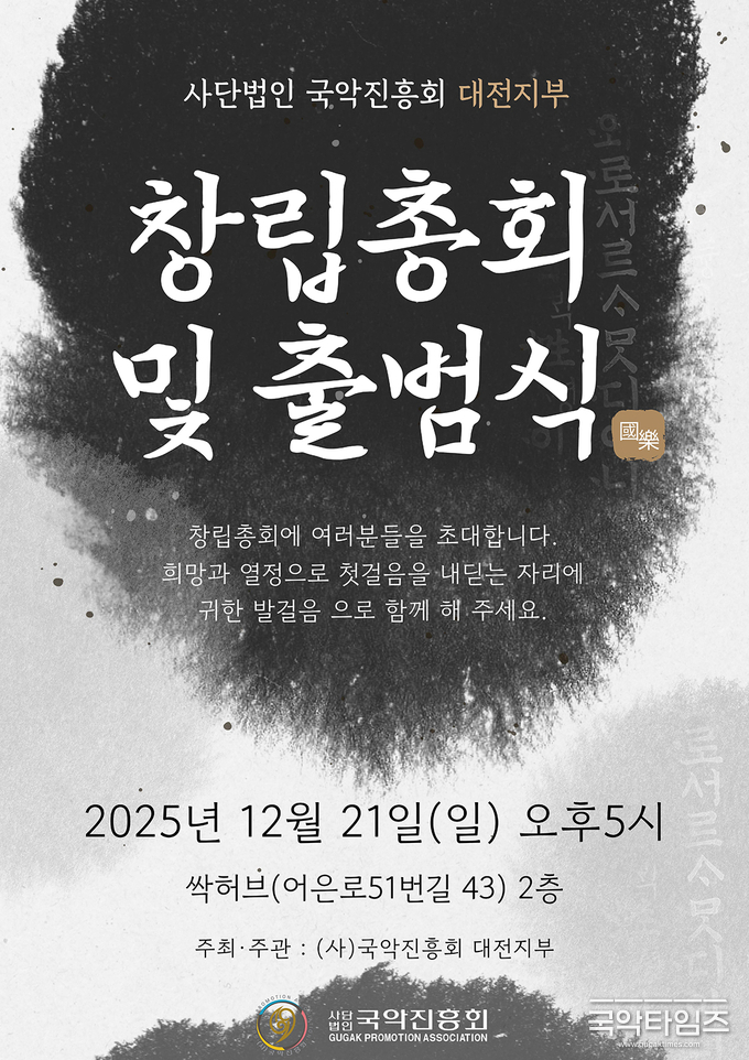 사단법인 국악진흥회 대전지부가 2025년 12월 21일 오후 5시 대전 유성구 싹허브에서 창립총회 및 출범식을 열고 공식 출범했다.