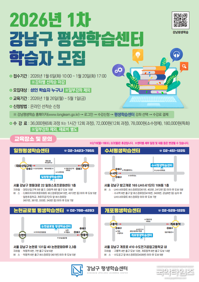 국악타임즈(대표 송혜근)는 2026년 병오년 새해를 맞이하여 서울 강남구 평생학습센터(www.longlearn.go.kr)에서 개설되는 2026년 1차 정기 강좌를 미리 탐색해 보았다.