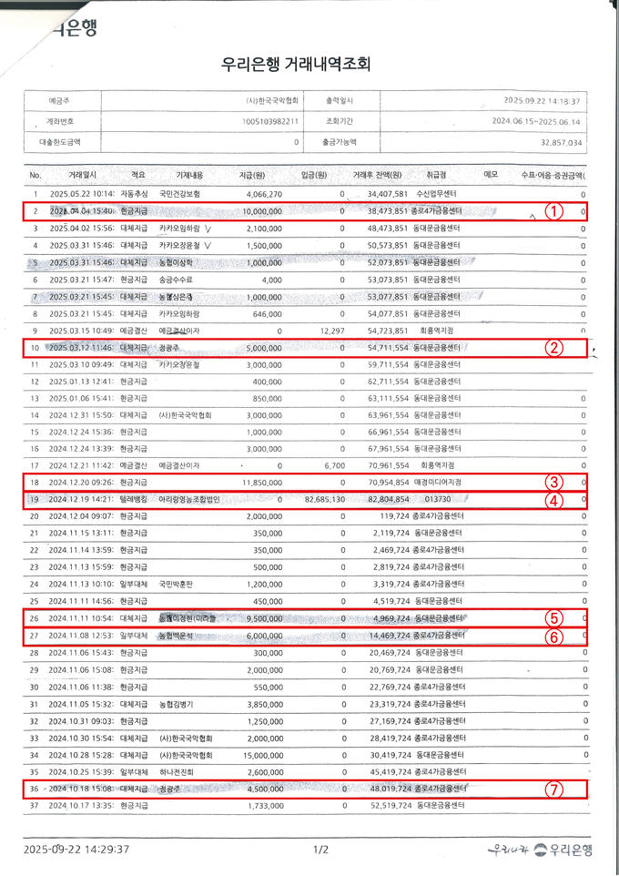 해당 기금은 목적성 기금으로, 사용을 위해 이사회 또는 총회의 사전 동의 절차가 필수적이며, 총회 전 감사의 관리·감독을 매년 받아야 하는 통장이다. 그러나 우리은행 통장 내역서에는 이용상 전 이사장 개인과 가족, 개인 사업체 직원과 얽힌 거래 내역이 빼곡히 기록되어 있었다.