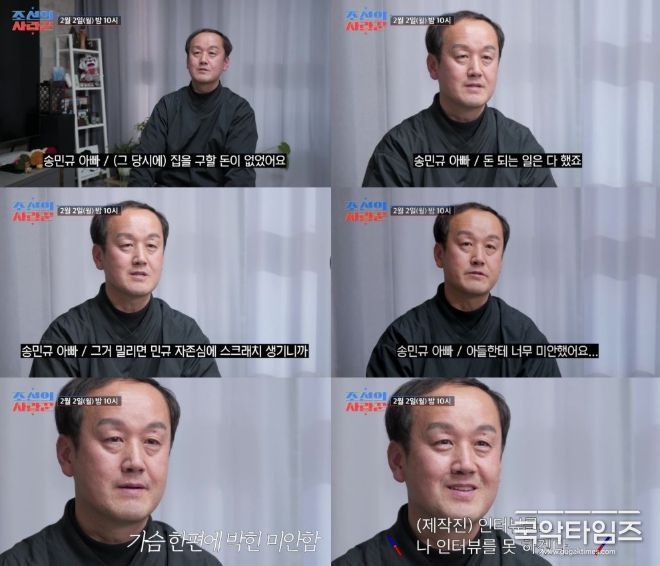 2월 2일(월) 방송될 '조선의 사랑꾼' 선공개 영상에서는 축구선수 송민규♥곽민선의 결혼식이 공개되는 가운데, 송민규의 아버지가 제작진과의 인터뷰에서 부자의 어린 시절 기억을 소환한다. 송민규의 아버지는 "(그 당시에) 집을 구할 돈이 없었다. 누가 들어와서 살라고 해서 살기도 하고, 임시로 살다가 '방 빼줘야겠어' 하면 아내와 짐 싸서 다녔다"라면서 부족한 형편에 논산에서만 7번을 쫓기듯 이사 다닌 경험을 전했다.