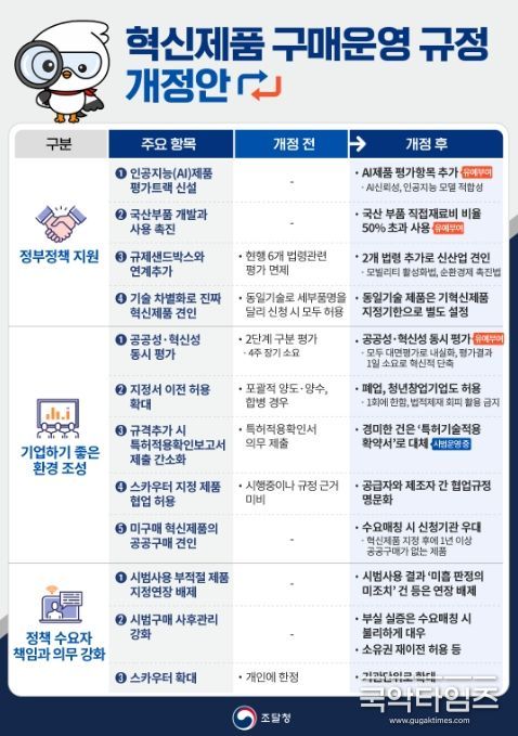 국악타임즈 편집부 | 조달청은 공공분야 혁신조달을 확대하여 우리 경제의 혁신 성장을 견인하기 위해 '혁신제품 구매 운영 규정'을 개정하여 2월 3일부터 시행한다.