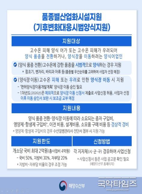 국악타임즈 편집부 | 해양수산부는 기후변화에 선제적으로 대응하고 어가의 소득 안정을 도모하기 위해 2월 23일부터 3월 31일까지 ‘2026년 기후변화 대응 시범 양식 지원사업’ 대상 어가를 공모한다고 밝혔다.