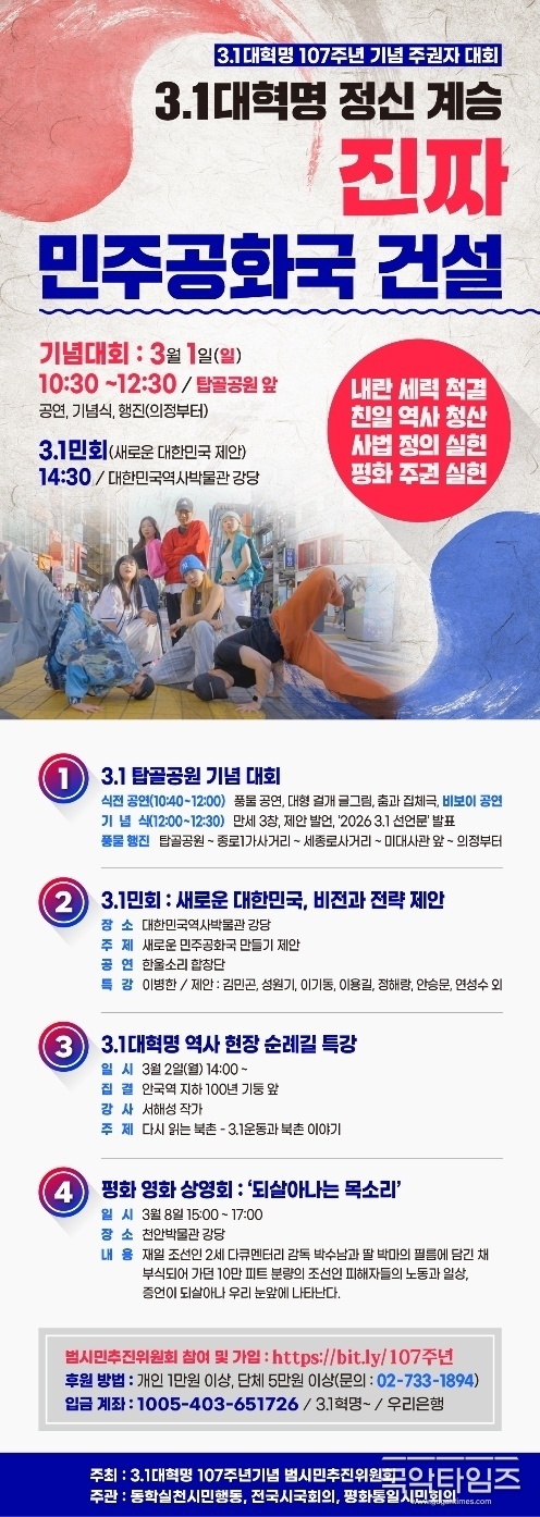 오는 3월 1일, 3.1대혁명 107주년을 맞아 서울 탑골공원 일대에서 ‘3.1대혁명 정신 계승, 진짜 민주공화국 건설’을 기치로 한 기념대회가 열린다. 이번 행사는 3.1대혁명 107주년기념 범시민추진위원회 주최, 동학실천시민행동, 전국시국회의, 평화통일시민회의 주관으로 진행되며, 기념대회와 시민대행진, 문화공연, 역사 순례 특강, 평화 영화 상영회 등 다채로운 프로그램으로 구성됐다.