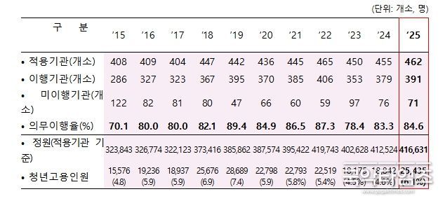 2025년 공공기관 청년고용의무 이행결과에 따르면, 적용기관 462개소의 84.6%(391개소)가 청년고용의무를 이행한 것으로 조사되어 2024년(83.3%, 379개소) 대비 1.3%p(+12개소) 증가했다.