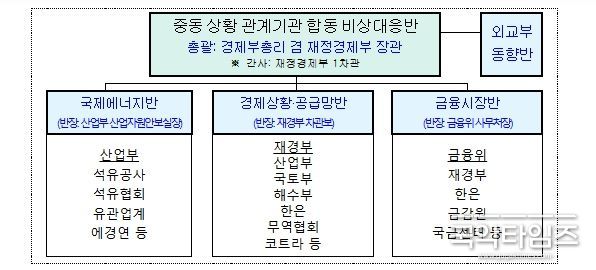 정부는 경제부총리를 중심으로 중동 상황 관련 실물경제, 에너지, 금융시장, 중동 동향 등에 대한 관계기관 합동 비상대응반을 가동하고 중동 현지 상황과 국내외 금융시장, 에너지·수출·해운·항공·공급망 등 실물경제 영향을 24시간 모니터링해 나갈 계획이다. 아울러, 이상징후 발생 시 준비된 상황별 대응계획(Contingency plan)에 따라 관계기관 간 공조 하에 신속하게 대응해 나갈 계획이다.