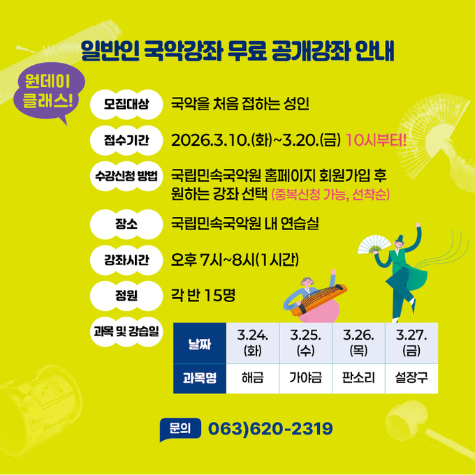 수강료는 무료이며 강습에 필요한 악기는 국립민속국악원에서 제공해 초보자도 부담 없이 참여할 수 있다. 신청은 국립민속국악원 누리집을 통해 가능하며 중복 신청도 가능하다.