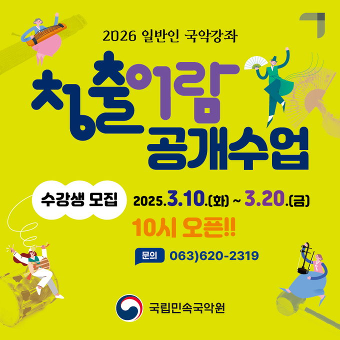 국립민속국악원이 일반인을 위한 국악 입문 프로그램 ‘청출어람’ 공개수업을 운영하며 수강생을 모집한다. 이번 강좌는 국악을 처음 접하는 성인들이 전통예술을 직접 체험하며 친숙하게 접근할 수 있도록 마련됐다.