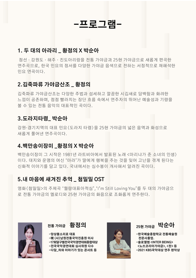 공연에는 전통가야금 연주자 황정의와 25현 가야금 연주자 박순아가 참여한다. 두 연주자는 각각 전통 가야금과 개량 가야금의 음색을 바탕으로 협연을 펼치며, 국악의 전통성과 현대성을 동시에 조명한다.