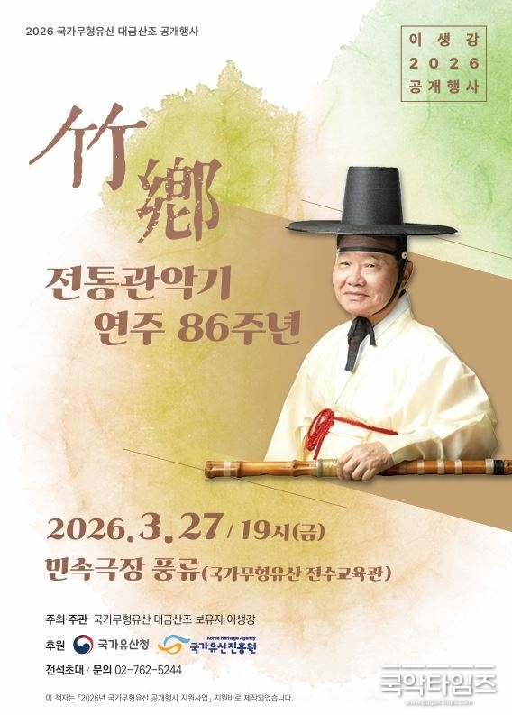 국가무형유산 대금산조 보유자 이생강 명인이 전통 관악기의 깊은 울림을 담은 무대로 관객과 만난다. ‘전통관악기 연주 86주년’을 기념하는 이번 공연은 오는 3월 27일 오후 7시, 민속극장 풍류(국가무형유산 전수교육관)에서 열린다.