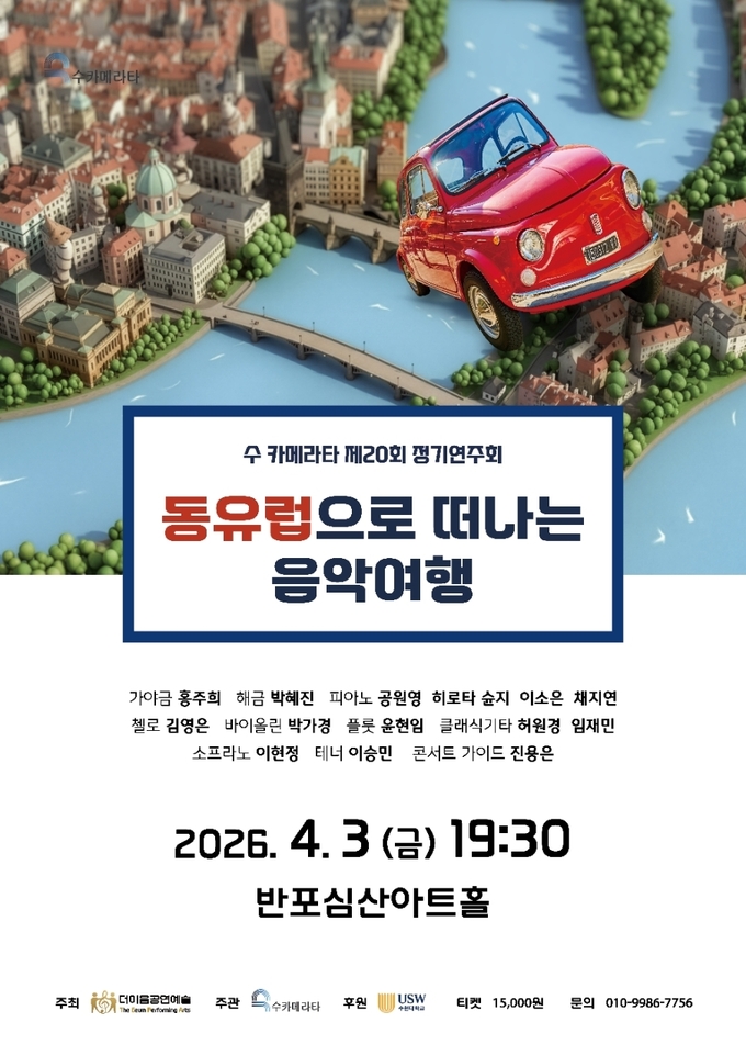 수카메라타가 제20회 정기연주회 ‘동유럽으로 떠나는 음악여행’을 4월 3일 오후 7시 30분 반포심산아트홀에서 선보인다. 이번 공연은 한국 전통음악을 출발점으로 삼아 동유럽 음악으로 확장해 나가는 구성으로, 동서양 음악의 흐름을 하나의 무대로 엮어낸 점에서 주목된다.