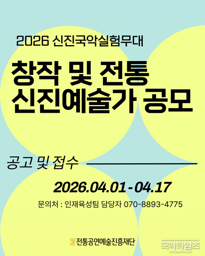 전통공연예술진흥재단(이사장 배영호)이 차세대 국악을 이끌 신진 예술가 발굴에 나선다. 재단은 ‘2026 신진국악실험무대’에 참여할 창작 및 전통 분야 예술가를 4월 1일부터 17일까지 공개 모집한다.