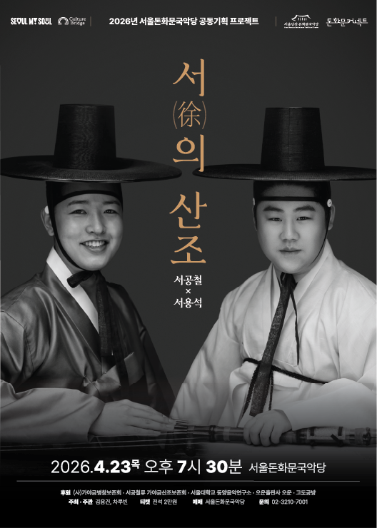 4월 23일 공연되는 ‘서(徐)의 산조-서공철X서용석’은 서공철류 가야금산조와 서용석류 대금산조를 중심으로 구성된다. 김용건은 서공철류 특유의 섬세한 농현과 여음의 미학을 밀도 있게 구현하며, 차루빈은 서용석류 대금산조의 강건한 호흡과 판소리적 시김새를 통해 극적 긴장감을 형성한다.
