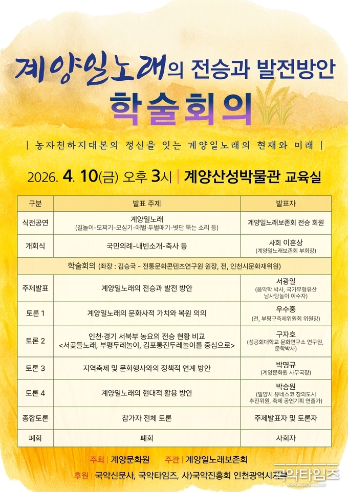 계양문화원 신선호 원장은 “이번 학술회의를 통해 계양일노래가 과거의 유산에 머무르지 않고 현재와 미래를 잇는 살아있는 문화로 자리매김할 수 있도록 다양한 전승 모델을 마련해 나가겠다”고 밝혔다.