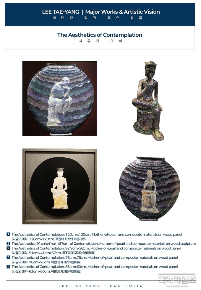 이어지는 ‘지킴의 미학’은 보다 확장된 시선이다. 각 민족과 문화가 간직해온 신성과 정신을 특정 종교의 형식에 가두지 않고, 보이는 상징과 보이지 않는 정신을 하나로 응축한다. 이는 단순한 형상의 재현이 아니라, 존재의 근원을 향한 조형적 질문이다. 이를 이어 작가가 도달한 현재의 지점은 ‘울림의 미학’이다. 인간이 태어나며 내는 첫울음이 생명의 시작을 알리는 원초적 소리에서 출발한 깊은 의식을 통하여 이태양 작품 속에서 이를 빛의 진동으로 구현한다. 그의 작업은 더 이상 시각적 형상에 머물지 않는 감각의 깊숙한 역사와 시간 속에서 울리는 존재의 언어로 확장된다.