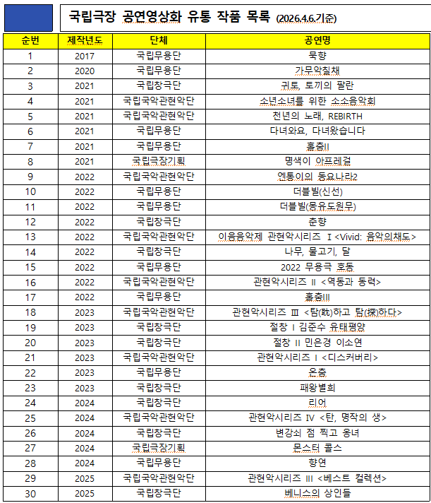 상영작으로는 국립창극단 ‘리어’, ‘패왕별희’, 국립무용단 ‘향연’, 국립국악관현악단 ‘엔통이의 동요나라 2’, ‘천년의 노래, REBIRTH’ 등 총 30편이 포함된다. 전통예술의 깊이와 현대적 감각이 결합된 작품들이 고루 마련돼 있다.
