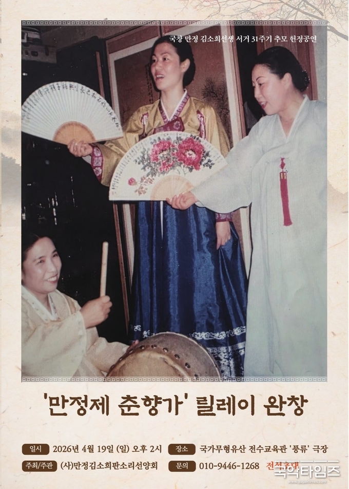 (사)만정김소희판소리선양회(이사장 신영희)가 국창 만정 김소희 선생의 예술혼을 기리는 뜻깊은 무대를 마련한다. 오는 2026년 4월 19일(일) 오후 2시, 서울 국가무형유산 전수교육관 ‘풍류극장'에서 열리는 <만정제 춘향가 릴레이 완창> 공연이 바로 그 자리다.