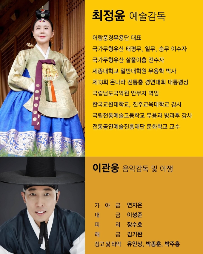 예술감독 최정윤은 어람풍경무용단 대표로 국가무형유산 태평무·일무·승무 이수자이며, 국가무형유산 살풀이춤 전수자로 활동해 왔다. 세종대학교 일반대학원 무용학 박사 출신으로 전통춤의 이론과 현장을 함께 아우르는 무용가다. 제13회 온나라 전통춤 경연대회 대통령상 수상 경력도 갖고 있다.
