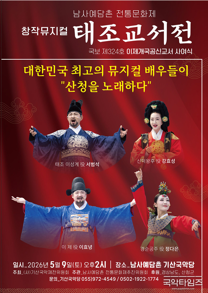 남사예담촌 전통문화제의 대표 프로그램인 창작뮤지컬 ‘태조교서전’이 오는 5월 9일 오후 2시, 산청 남사예담촌 기산국악당에서 막을 올린다. 이번 공연은 국보 제324호 ‘이제개국공신교서’ 서사(敍事)를 바탕으로, 조선 건국의 역사적 순간을 음악과 무대로 재해석한 작품이다.