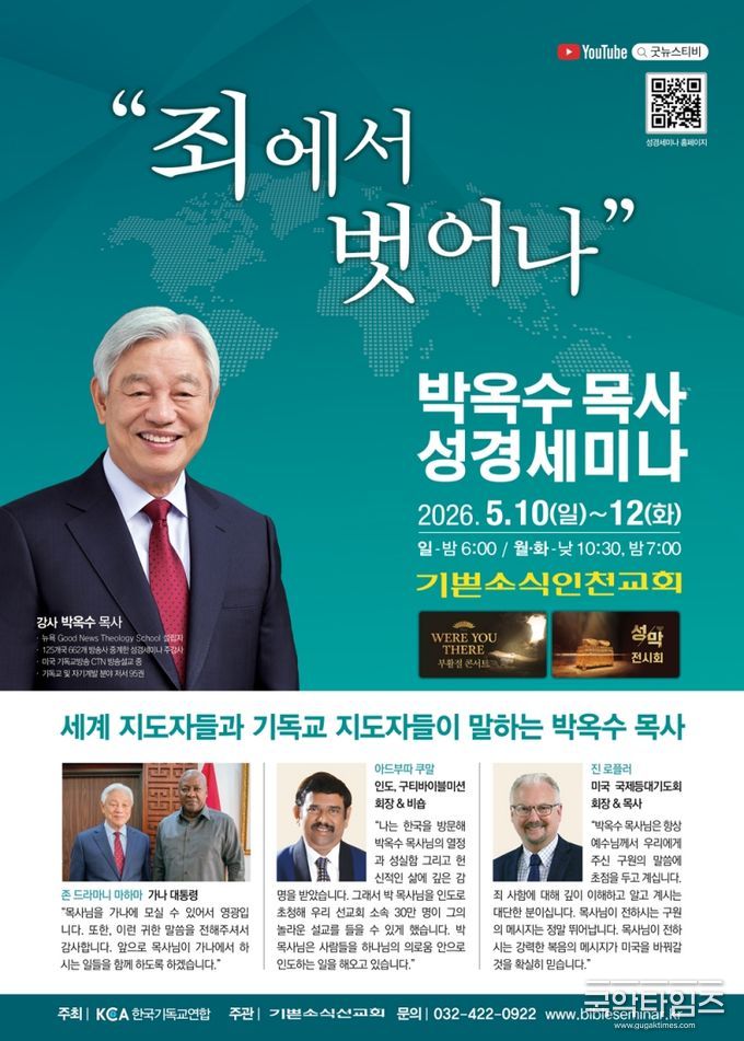 국악타임즈 편집부 | ‘2026 박옥수 목사 성경세미나’가 5월 10일(일)부터 12일(화)까지 3일간 기쁜소식인천교회에서 열린다.